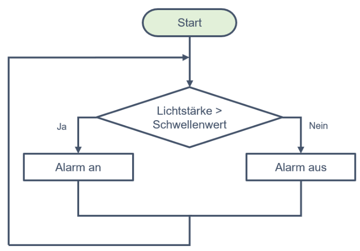 In diesem Kapitel programmierst du mit MakeCode den Algorithmus für den Rauchmelder. In einem vorherigen Kapitel haben wir bereits ein Flussdiagramm entwickelt, dass diesen Algorithmus darstellt.