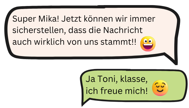 Mika und Toni freuen sich, dass sie ihre Kommunikation nun sicher gestalten können und immer wissen, dass die Nachricht auch wirklich von ihnen gegenseitig kommt.